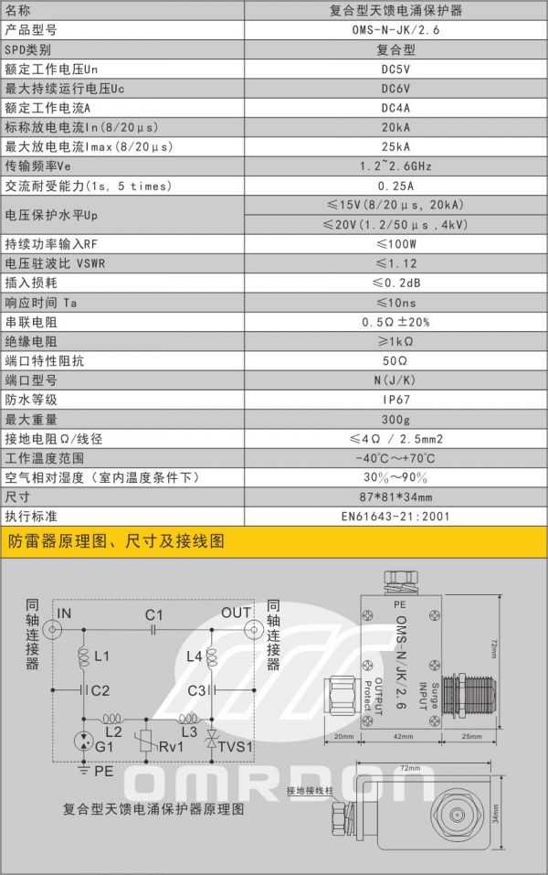 歐姆雷盾(OMRDON)1.2-2.6G天饋電涌保護器(SPD、防雷器)是專門為GPS/BD通訊基站通信頻段收發(fā)系統設計,使其免遭由天饋線引入的感應雷擊及靜電放電等過電壓損壞。本產品具有防水、防塵功能,可用于室外安裝場所。