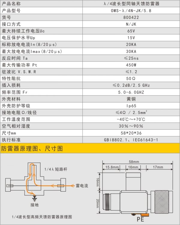 歐姆雷盾(omrdon)OMS-λ/4N-JK/5.8天饋電涌保護(hù)器(天饋避雷器、天饋防雷器)是適用于各種射頻收發(fā)系統(tǒng)、無線網(wǎng)絡(luò)信號(hào)發(fā)射,衛(wèi)星電視接收設(shè)備、監(jiān)控信號(hào)無線發(fā)射接收設(shè)備的防雷保護(hù)。廣泛應(yīng)用于通信站、雷達(dá)站、小靈通基站、移動(dòng)通信基站、GPS基站、CDMA基站、PHS(PAS)基站、衛(wèi)星通信、微波站等。能防止因饋線感應(yīng)雷擊過電壓而對(duì)天線及收發(fā)設(shè)備造成的損害,安裝于防雷分區(qū)LPZ0A-1及后續(xù)分區(qū)。