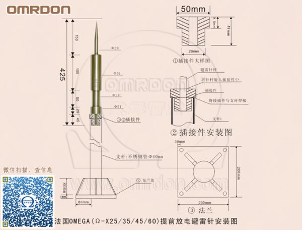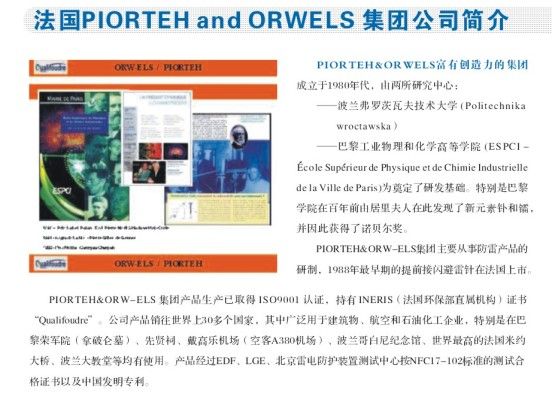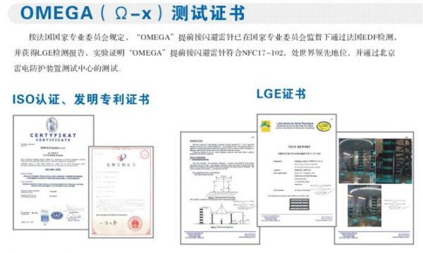 OMEGA:Ω-X提前放電避雷針由法國PIORTEH & WRWELS集團公司研制,公司已取得ISO9001認證,持有INERIS(法國環(huán)保直屬機構(gòu))證書,公司產(chǎn)品銷住世界30多個國家和地區(qū),廣泛用于建筑物、航空、和石化企業(yè),如:巴黎榮軍院(拿破侖墓)、先賢祠、戴高爾機場、波蘭哥白尼紀念館、世界最高的法國米約大橋、波蘭大教等名建筑中均有使用。產(chǎn)品已通過EDF、LGE、北京雷電防護裝置測試中心的檢測報告和中國發(fā)明專利,產(chǎn)品由太平洋保險公司承保。