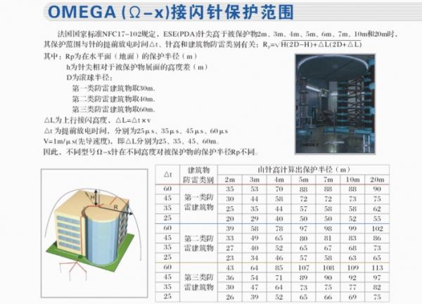根據(jù)法國國家標準NFC—17—102規(guī)定,ESE(“提前接閃”的英文縮寫)針尖高于被保護物2m、4m、5m、6m、7m、10m和20m時,其保護范圍與避雷針的提前放電時間△T、針高和建筑物的防雷類別有關(guān):