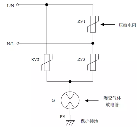 2.缺點(diǎn):壓敏電阻RV1 短路失效后易引起火災(zāi)。最好在每個(gè)壓敏電阻上串聯(lián)一個(gè)工頻保險(xiǎn)絲以防壓敏電阻短路起火。如果L、N 線不可能接反,則可省去壓敏電阻RV2、RV3,將放電管G 的上端直接接到N 線上,構(gòu)成“1+1”電路。