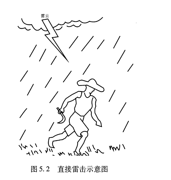 當(dāng)雷云對地放電時,凡在戶外工作,在建筑物項上施工,在曠野荒郊行走,在水面上作業(yè)或活動,在山上露營和探礦,甚至在建筑平臺觀景的人們,都有可能被閃電直接擊中。因為當(dāng)閃電的先導(dǎo)放電通道端頭下串到地面物體上方大約20~30m時,在人體周圍沒有其他更高豎立導(dǎo)體的情況下,人體就會成為雷電襲擊的目標(biāo)。這時人頭頂上空的電場強(qiáng)度驟增,于是從人頭頂便發(fā)出向上的回閃放電。當(dāng)這種放電與雷云下行先導(dǎo)放電通道接通時,強(qiáng)大的雷電流便通過人體并經(jīng)過兩腳人地了,如圖5.2所示。這樣就是所謂的人體遭受到直接雷擊。