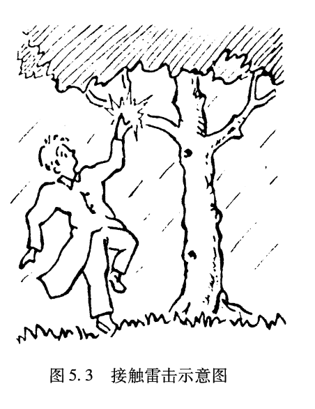 接觸雷擊大多數(shù)都是在雷電放電時,人的手或軀干碰到了建筑物避雷裝置的引下線,或與其相連的自來水管、電氣設(shè)備的接地線等情況下發(fā)生的。圖5.3所示為人在大樹下避雨時,人的手不小心碰到了著雷的大樹樹杈所發(fā)生的雷擊情況。當(dāng)雷電流沿著大樹的樹干入地時,由于樹干有電阻和電感,因而從手與樹權(quán)的接觸點到地面的這一段樹干上便存在著一一個電位差,這稱之為“接觸電位差”或“接觸電壓”,它可以表達(dá)為: