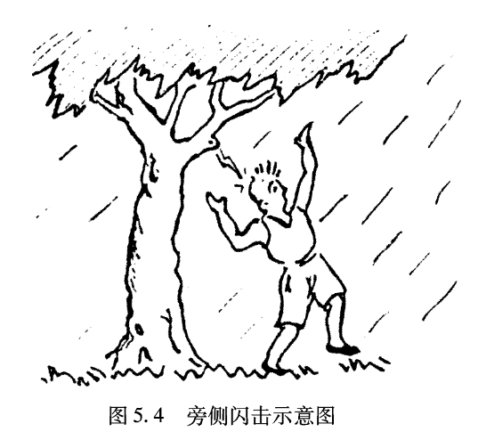 如上所述,當(dāng)雷電擊到某- - 物體上時,該物體便被充電到幾萬伏,甚至幾十萬伏的高壓上,有時人站在這個被雷擊的物體附近,盡管人體的任何部位,如手和腳等都沒有碰到該物體,但是人體與大地是等電位的,人的頭頂或軀干與等高的被雷擊物體之間形成的高電位差超過了其間空氣的擊穿強(qiáng)度,這時雷電流也會由高電位的被雷擊物體,通過這段空氣間隙向人體放電,于是人體便會遭受到不測的雷電襲擊,如圖5.4所示。這稱之為旁側(cè)閃擊或側(cè)擊。