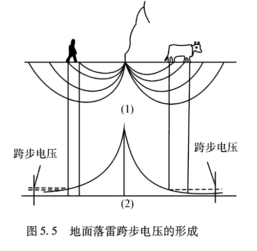 當(dāng)?shù)孛媛淅谆虮芾籽b置的引下線將雷電流疏導(dǎo)人地時,人地點的電位被大大抬高,雷電流將從該點向周圍遠(yuǎn)處擴(kuò)散。由于土壤有一-定電阻率,雷電流在地面輻射 (1)方向上各點間有電位降。離開落雷點或人地點愈遠(yuǎn)電流密度愈小,形成的電位降也愈大。沿落雷或人地點周圍的地面電位分布呈喇叭形曲線降低,如圖5.5所示。如果有人站立或行走在落雷點或入地點附近,則兩腳之間就會受到一個電位差,該電位差就是所謂的“跨步電位差”或“跨步電壓”,它的大小可以由下面公式來計算:
