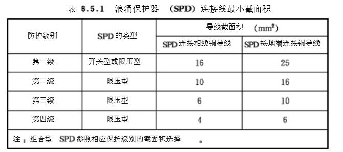 3.浪涌保護(hù)器(SPD)的連接導(dǎo)線最小截面積宜符合表6.5.1的規(guī)定