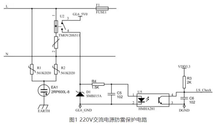 本電路由于采用了金屬氧化鋅壓敏電阻U2,因此能有效地避免傳統(tǒng)的氧化鋅壓敏電阻因短路失效可能帶來的火災等安全隱患。與此同時,如果因為雷擊損壞時,其隔離的熔斷保險絲將同時熔斷,主機CPU可以在LS_Check端檢測到相應的信號,從而起到雷擊損壞報警功能。