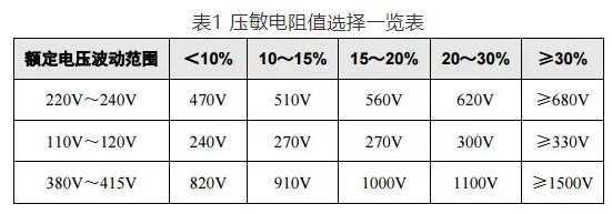 壓敏電阻的壓敏電壓值可參考表1選取,壓敏電壓值可以適當選高一點,這樣更安全、耐用,故障率低,但殘壓略高。然后根據(jù)通流容量要求選擇外形尺寸和封裝形式,或采用幾個壓敏電阻并聯(lián),注意應挑選壓敏電壓值相近的并聯(lián),每個壓敏電阻都要單獨串聯(lián)溫度保險管,以延長使用壽命和確保安全。