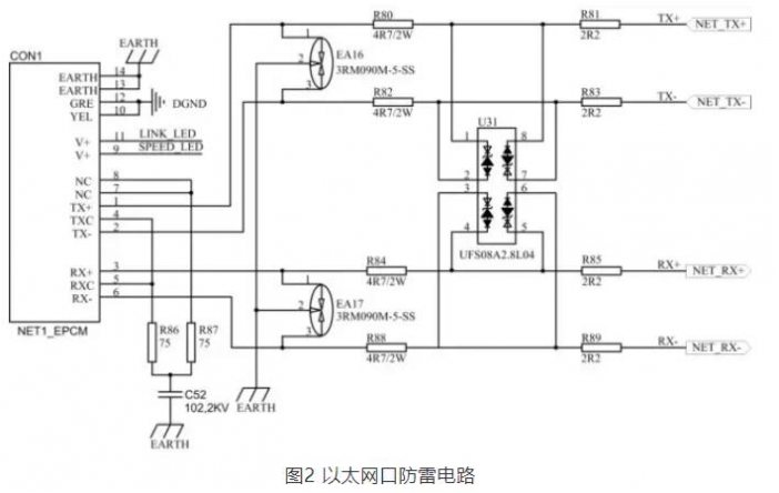 在如圖2所示的網(wǎng)口防雷電路中,在網(wǎng)絡(luò)變壓器和網(wǎng)口插座之間增加放電管和雙向瞬態(tài)電壓泄放電路組成的兩級防護電路,極大的增強了網(wǎng)口的差模防護能力。第一限流電阻R80、R82、R84、R88和氣體放電管EA16、EA17組成了一級防護電路,對雷擊的浪涌電壓進(jìn)行第一級保護,具有泄放雷電暫態(tài)過電流和限流過電壓作用。一級防護電路可以產(chǎn)生很大的泄放電流(3KA),大部分入侵能量通過地泄放。