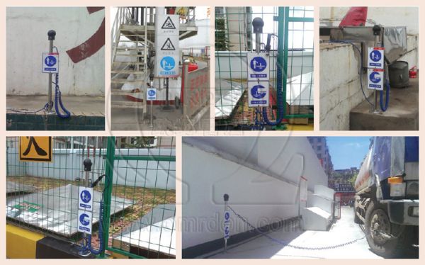 第14.3.13條規(guī)定:由于人們穿著人造織物衣服極為普遍,人造織物極易產(chǎn)生靜電,往往積聚在人體上。為防靜電可能產(chǎn)生的火花,需對進(jìn)入輕油泵房、輕油罐頂上、輕油作業(yè)區(qū)的操作平臺(tái),以及爆炸危險(xiǎn)區(qū)域等處的扶梯上或入口處設(shè)置消除人體靜電的裝置。此消除靜電裝置是指用金屬管做成的扶手,在進(jìn)入這些場所之前人體應(yīng)撫摸此扶手以消除人體靜電。